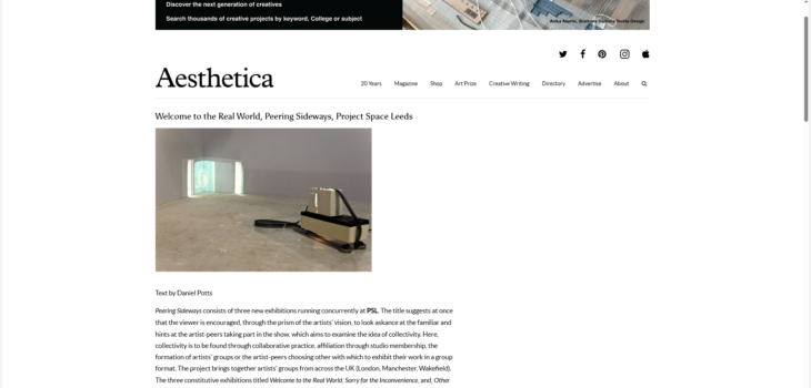 Articles Welcome to the Real World. Peering Sideways. Project Space… September 20, 2011July 21, 2024 by danpotts Aesthetica Magazine Blog. Welcome to the Real World. Peering Sideways. Project Space Leeds. Mario Merz: What is To Be Done? Henry Moore Institute. Leeds Anri Sala: Why the Lion Roars. Serpentine Gallery. London