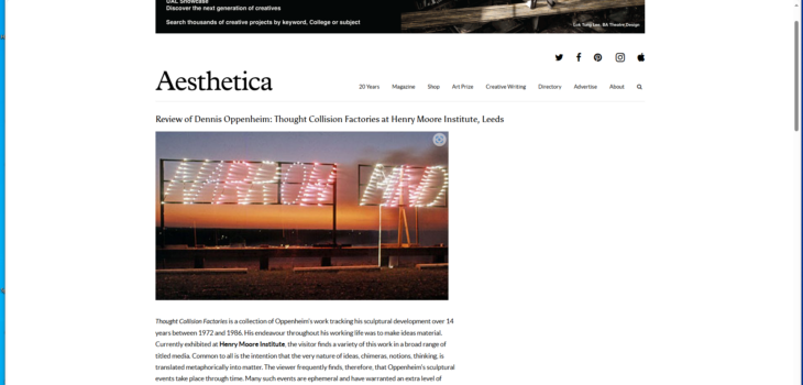 Articles Oppenheim: Thought Collision Factories. Henry Moore Institute. December 11, 2013July 20, 2024 by danpotts Aesthetica. Oppenheim: Thought Collision Factories. Henry Moore Institute. Festival of Britten. Peter Grimes. Opera North. Art Turning Left: How Values Changed Making 1789-2013. Liverpool Tate.